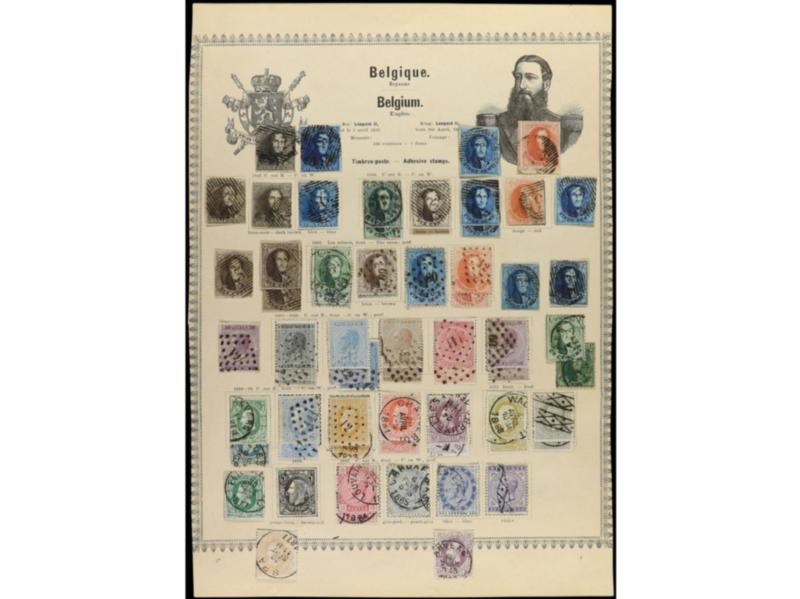 BELGICA. 1849-85. Tres páginas de álbum con sellos usados, también sellos de tasas, paquetes postales y enteros postales recortados. (Image1)
