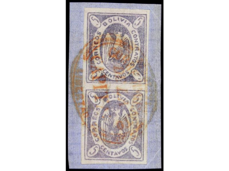 BOLIVIA. 1867-68. 5 ctvos. violeta pareja sobre fragmento. Mat. ovalado en rojo CORREO DE LA CAPITAL. PRECIOSO. Yv.3 (2). (Image1)