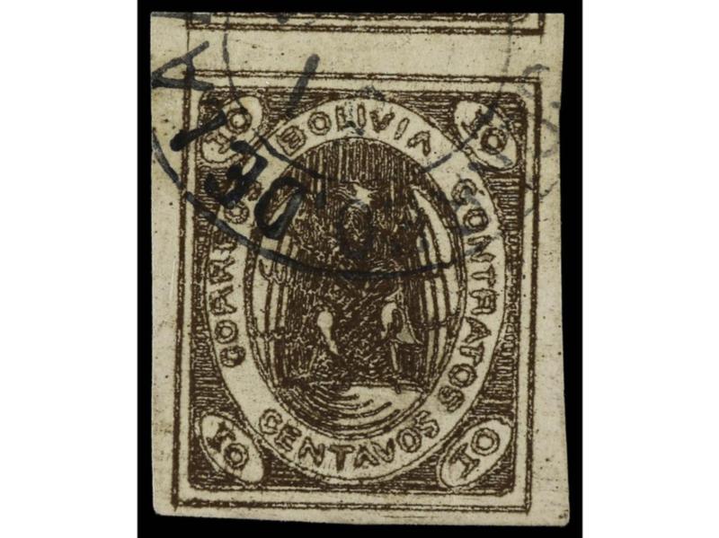 BOLIVIA. 1867-68. 10 ctvos. castaño. Mat. fechador de LA PAZ. Yv.4. (Image1)