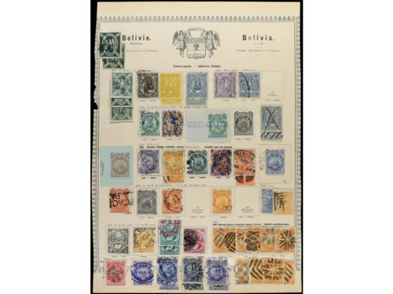 BOLIVIA. 1867-87. Página de álbum con sellos usados y algún entero postal recortado. (Image1)