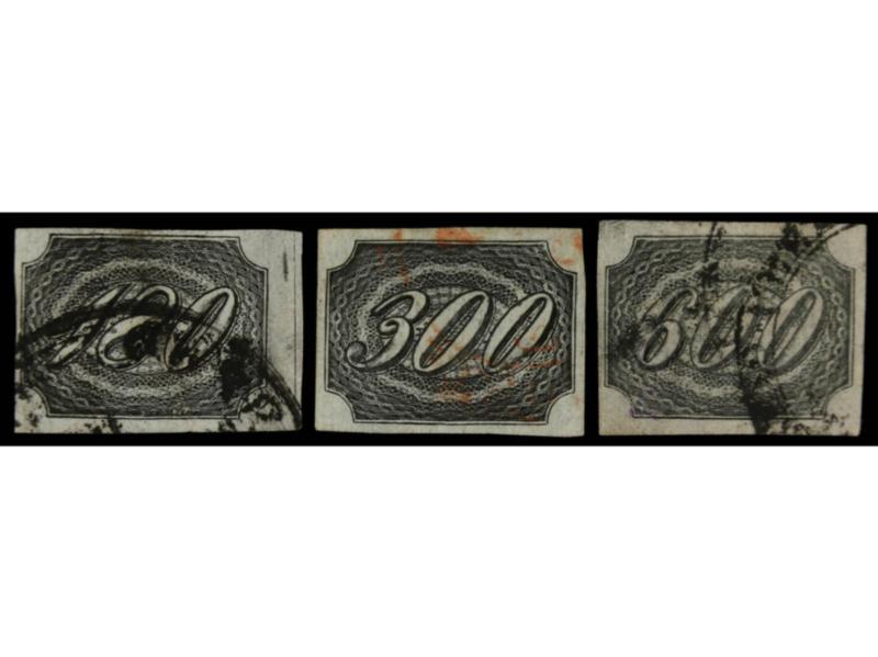 BRASIL. 1844-46. 180 reis negro, 300 reis negro y 600 reis negro. Tres preciosos ejemplares. Sellos MUY RAROS, particularmente sin defectos. Cert. Brian MOORHOUSE. Yv.8/10. (Image1)