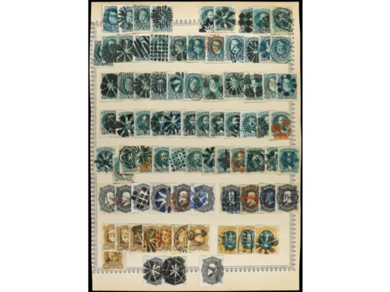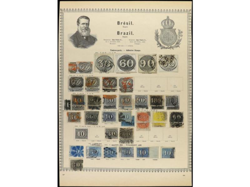 BRASIL. 1866-78. Tres páginas de álbum con sellos de las emisiones de DON PEDRO. Alrededor de 200 sellos todos con matasellos interesantes y preciosos, muchos raros. (Image1)