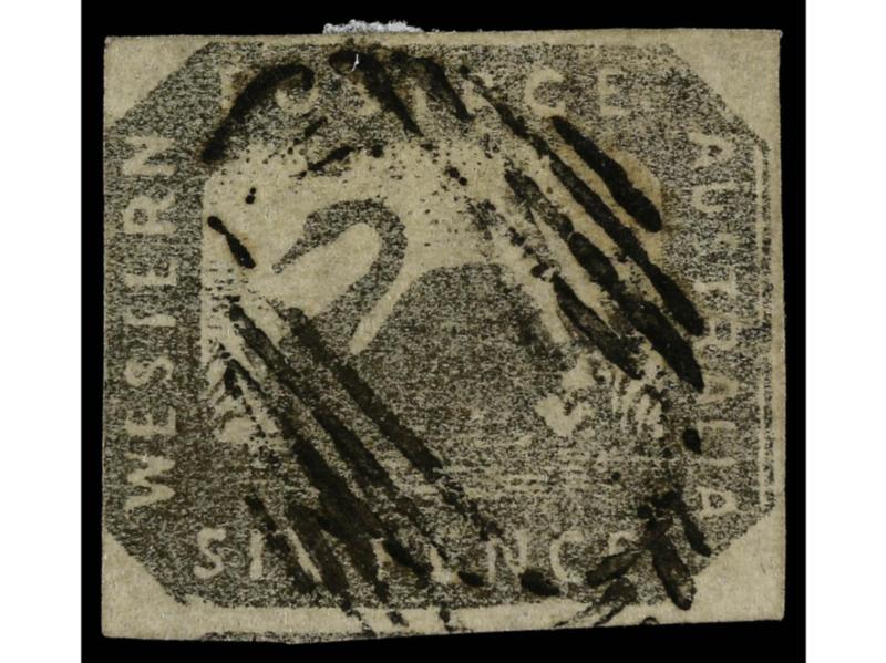 AUSTRALIA. 1854-57. AUSTRALIA OCCIDENTAL. 6 p. gris, margen izquierdo muy ajustado. Cert. R.P.S. y Behr. Yv.4. (Image1)