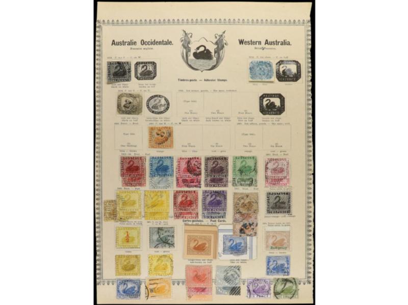 AUSTRALIA. 1854-85. Conjunto de 14 páginas de álbum con sellos nuevos y usados, también sellos de Servicio y enteros postales recortados. (Image1)