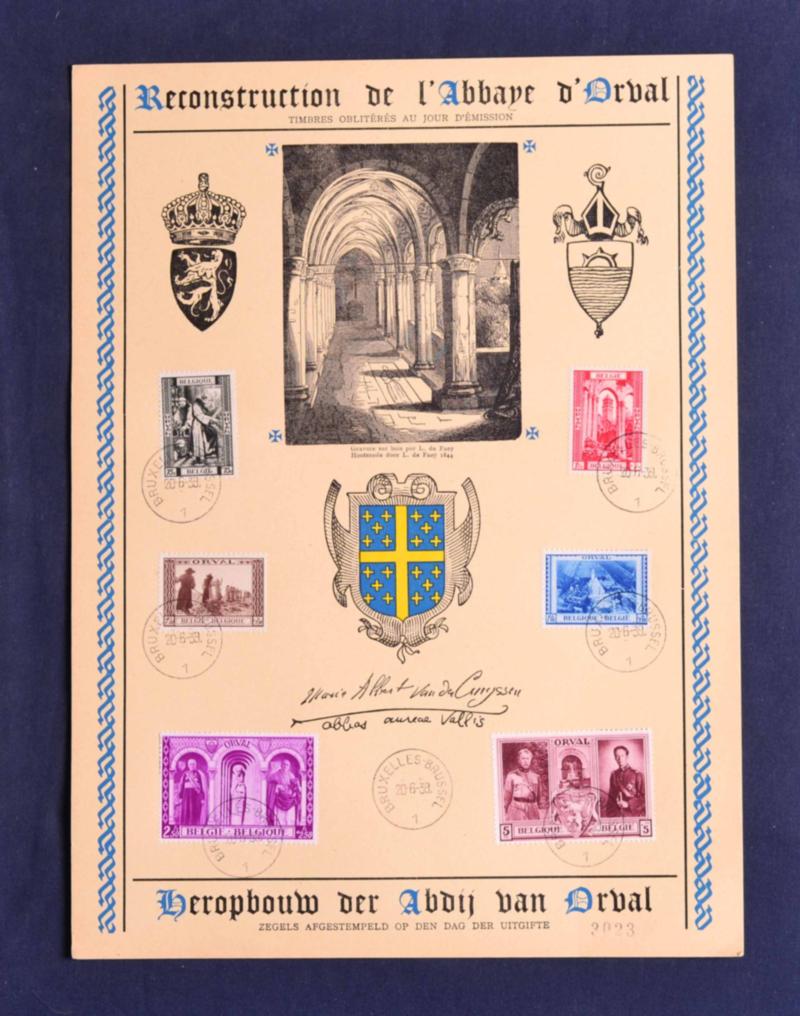 BELGIUM, 1939 ORVAL SEMI-POSTAL SET ON COMMEMORATIVE FIRST DAY PAGE, #B250-55, very fine (Image)