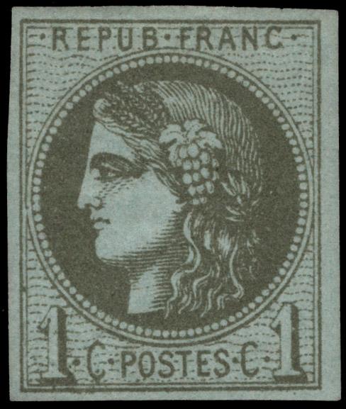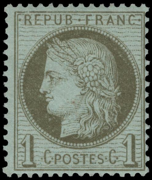 FRANCE, 1870, 1c OLIVE GREEN ON PALE BLUE NH, #50, fresh, fine, cat. $40.00, Yvert #50 @ €100.00 both values for hinged (Image)