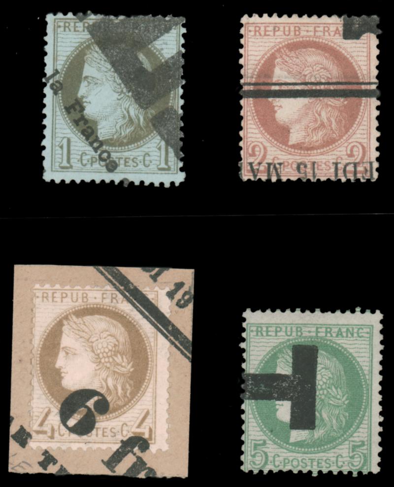 FRANCE, 1870-72 CERES TYPE WITH PRINTED CANCELS, #50, 51, 52, 53, each with distinct printed cancels, fine-very fine (Image)