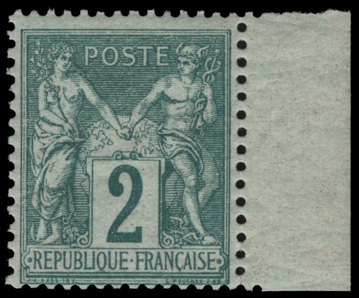 FRANCE, 1876, 2c GREEN TYPE II MINT NEVER HINGED, #77, fine-very fine, cat. $175.00, Yvert #74 @ €262.50 as NH (Image)