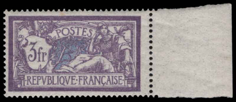 FRANCE, 1925, 3fr VIOLET & BLUE NH, #128, beautiful right selvage single, very fine, cat. $52.50, Yvert #206 @ €60.00 (Image)