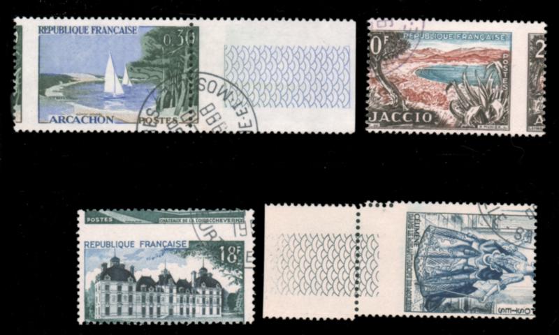 FRANCE, 1953-1961, MISPERF GROUP USED, #689 723, 724, 1008 vars, fresh and very fine as such, cat. Maury #965c, 980b, 981d, 1312e @ €320.00 (Image)