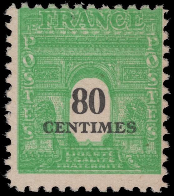 FRANCE, 1945, 80c EMERALD AMERICAN ISSUE AMG - DOUBLE IMPRESSION OF EMERALD COLOR - NH, #523E var., top margin single, fine, signed Brun and others, cat. Maury #706b @ €105.00 (Image)