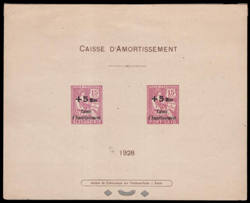 FRANCE, OFFICES IN ALEXANDRIA, 1928, 15m+5m RED VIOLET & VIOLET DE LUXE PROOF, B3P, B3aP, slight overall toning, fine-very fine, scarce (Image)