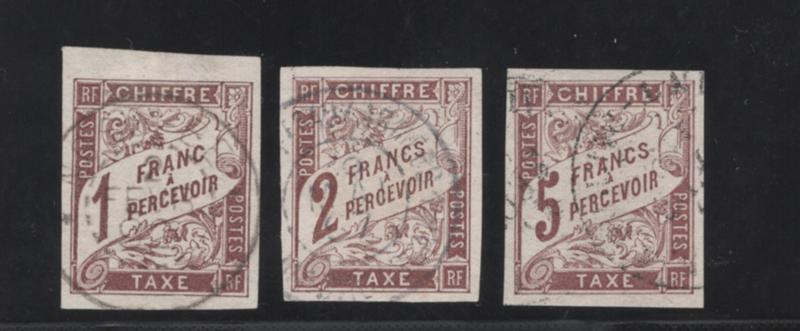 FRENCH COLONIES GENERAL ISSUES, 1884, 1fr-5fr BROWN POSTAGE DUE USED, #J12-J14, full margins, very fine, cat. $127.50, Yvert TT #15-17 @ €190.00 (Image)