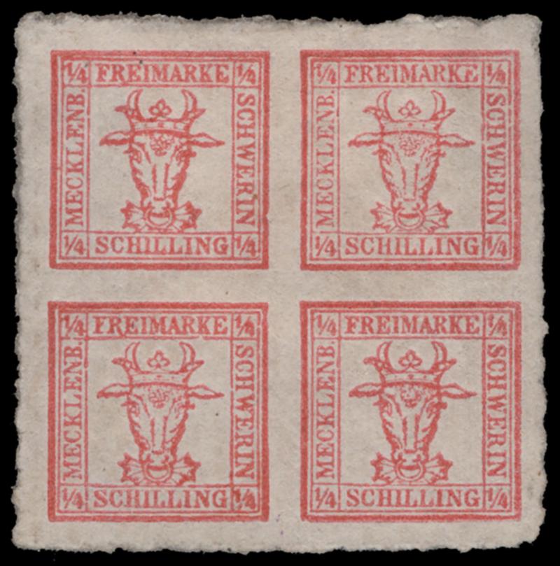 MECKLENBURG-SCHWERIN, 1864, FOUR ¼s RED ROULETTED MINT, #5, fresh, o.g., h.r., very fine, two older expert's marks on back, very fine, cat. $70.00 (Image)