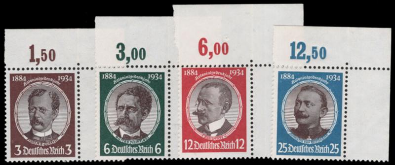 GERMANY, 1934 LOST COLONIES SET MINT NEVER HINGED, #432-35, imprint in top selvage, fresh, fine-very fine, cat. $154.00, Michel #540-43 @ €190.00 (Image)