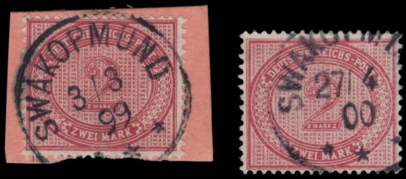 GERMANY USED IN SOUTHWEST AFRICA, 1899, 2m PURPLE BOTH SHADES, Swakopmund d.s., fine-very fine, both Steuer BPP, cat, Michel #VS37e-f @ €150.00 (Image)