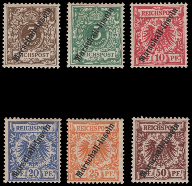 MARSHALL ISLANDS, 1897, 3pf-50pf FIRST OVERPRINT SET MINT, #1-6, fresh, LH or h.r., fine-very fine, all but 10pf and 20pf signed Bothe, cat. $590.00, Michel 1 II - 6 II @ €750.00 (Image)