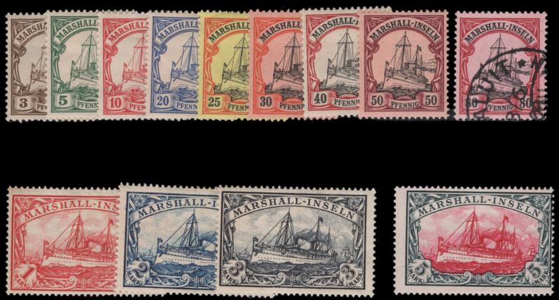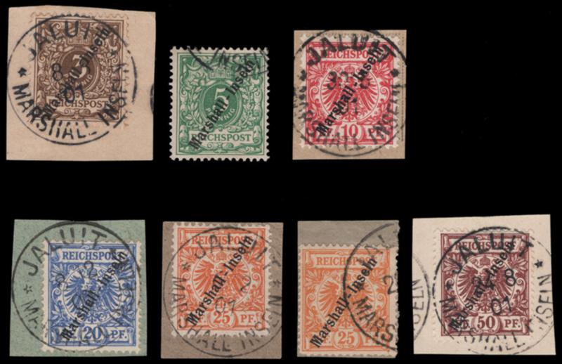 MARSHALL ISLANDS, 1899-1900, 3pf-50pf OVERPRINTS USED, #7-12, both Michel listed shades of 25pf, fine-very fine, each signed by a BPP expert, cat. $173.00, Michel #7-12, 11b @ €240.00 (Image)