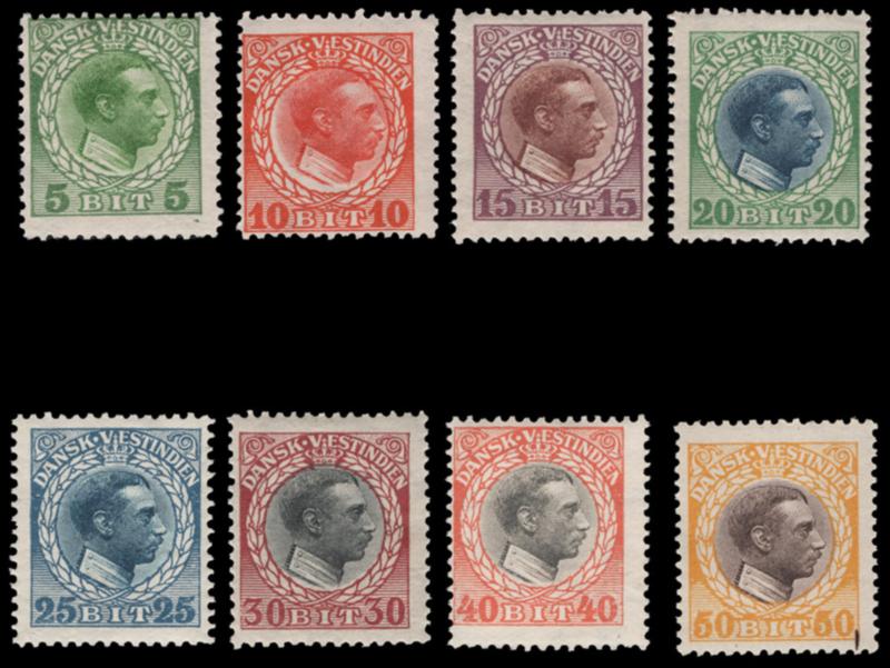 DANISH WEST INDIES, 1915, 5b-50b CHRISTIAN X MINT NEVER HINGED, #51-58, from old "new issue" stock, fresh and fine-very fine, cat. $31.75 as hinged, Facit SEK700.00 ($70.00+/-) as NH (Image)