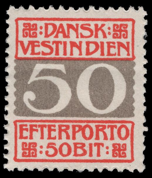 DANISH WEST INDIES, 1913, 50b RED & GRAY POSTAGE DUE PERF 14x14½ NH, #J8a, fresh, mint never hinged, natural gum bend, very fine, cat. $90.00 as hinged (Image)