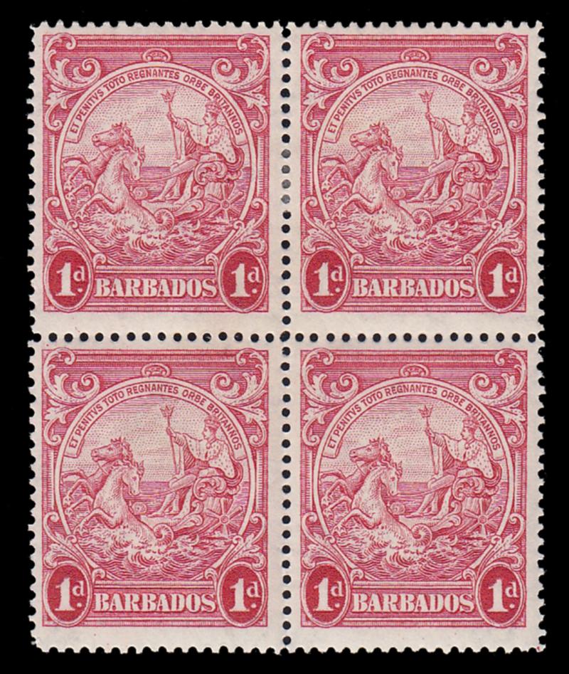 BARBADOS, 1938, 1p CARMINE PERF. 14 BLOCK MINT, #194, top pair lightly hinged, bottom pair never hinged, fresh and fine-very fine, cat. $68.00, Gibbons #249a @ £76.00 (Image)