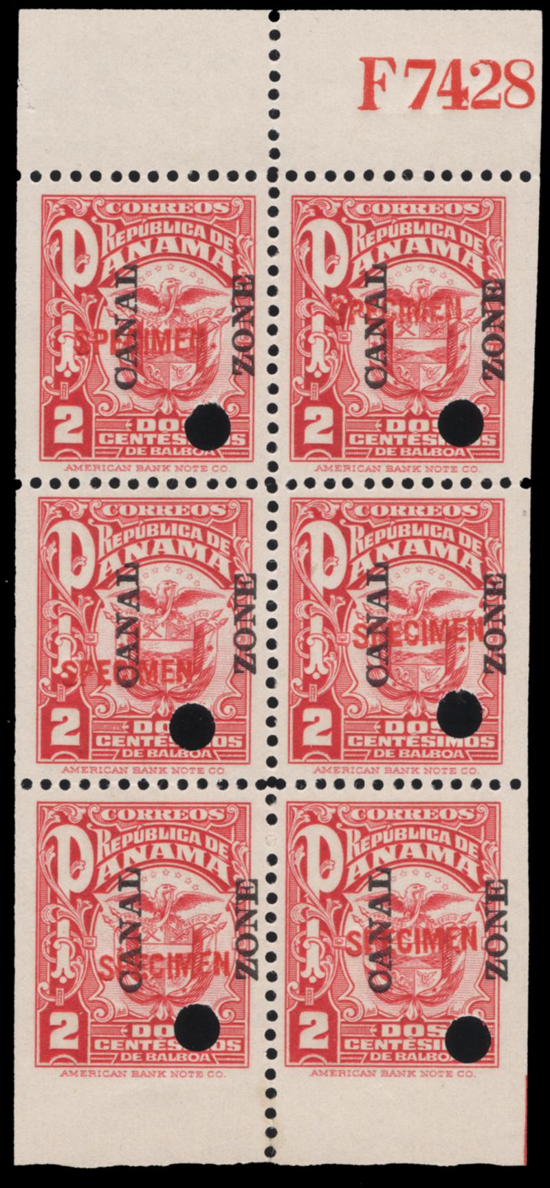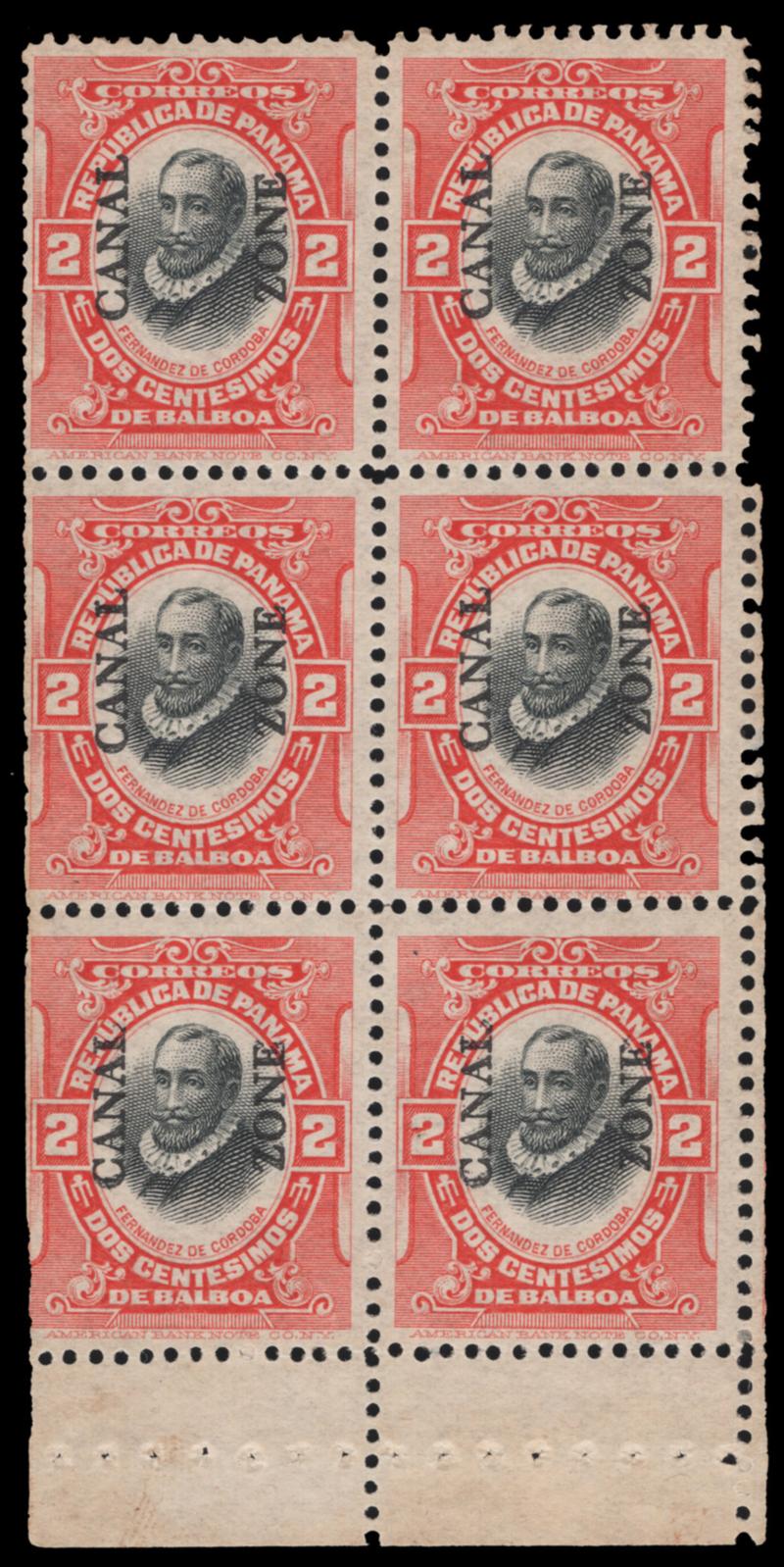 CANAL ZONE, 1909, 2c VERMILION & BLACK HANDMADE BOOKLET PANE OF SIX MINT, #32c, toned tropicalized gum, cut so that a a virtually full perf ro appears at right, scarce, cat. $800.00 (Image)