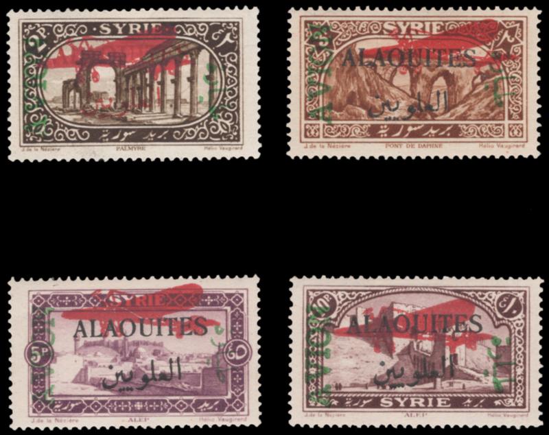 ALAOUITES, 1925, 2p-10p AIR POST WITH ADDITIONAL RED AIR PLANE OVERPRINT MINT, #C5-C8 vars., lightly hinged, very fine, Maury #A5-A8 @ €550.00 (Image)