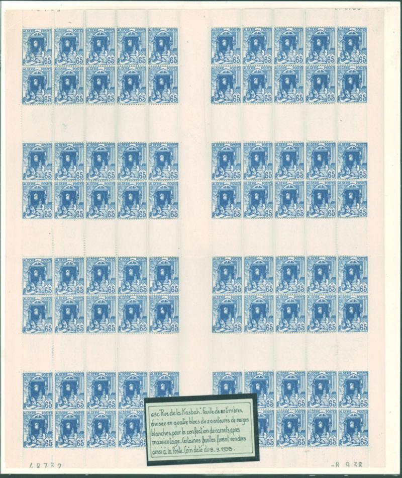 ALGERIA, 1938, 65c ULTRAMARINE BOOKLETPANE OF TEN IN COMPLETE SHEET OF EIGHT PANES MINT NEVER HINGED, #53a, fresh, mint never hinged, very fine, cat. Maury Booklet #21 @ €1,200.00 as full sheet (Image)