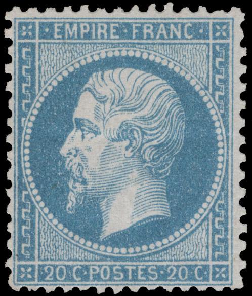 FRANCE, 1862, 20c BLUE ON BLUISH MINT, #26, fresh, lightly hinged, fine-very fine, cat. $200.00, Yvert #22 @ €420.00 (Image)
