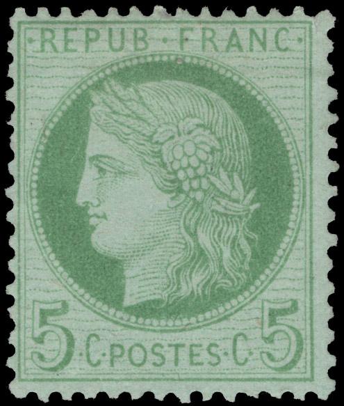 FRANCE, 1872, 5c YELLOW GREEN ON PALE BLUE MINT, #53, quite well-centered, previously hinged, fine-very fine, cat. $150.00, Yvert #53 @ €300.00 (Image)