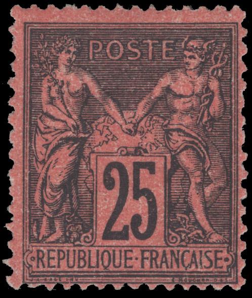 FRANCE, 1878, 25c BLACK ON RED TYPE II MINT, #93, fresh, very lightly hinged, fine-very fine, cat. $1,075.00, Yvert #91 @ €1,600.00 (Image)