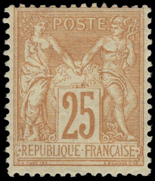 FRANCE, 1879, 25c YELLOW TYPE II MINT, #99, well-centered, very lightly hinged, extremely fine, cat. $340.00, Yvert #92 @ €600.00 (€900.00 in premium centering) (Image)