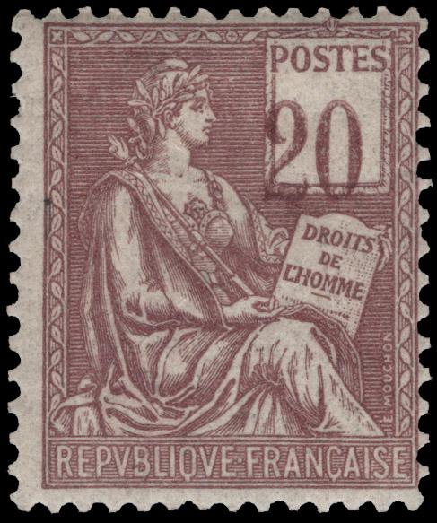 FRANCE, 1900, 20c BROWN VIOLET - DISPLACED NUMERALS - NH, #118 var., fresh, fine-very fine, signed J F Brun, cat. Yvert #113a @ €300.00 (Image)