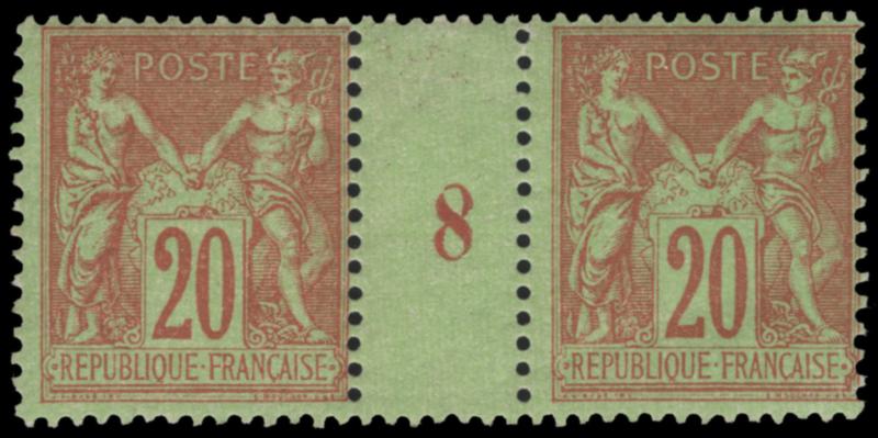 FRANCE, 1879, 20c RED ON YELLOW GREEN MILLÉSIMES #8 PAIR NH, #98, fresh, fine-very fine,. cat. Yvert #96 @ €250.00 (Image)