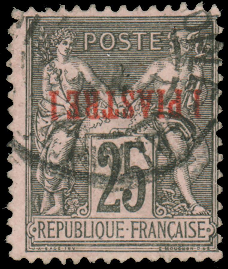 FRANCE, OFFICES IN LEVANT, 1886, 1pi on 25c BLACK ON ROSE - INVERTED SURCHARGE - USED, #2a, fine-very fine, cat. $325.00, Maury #4c @ €400.00 (Image)