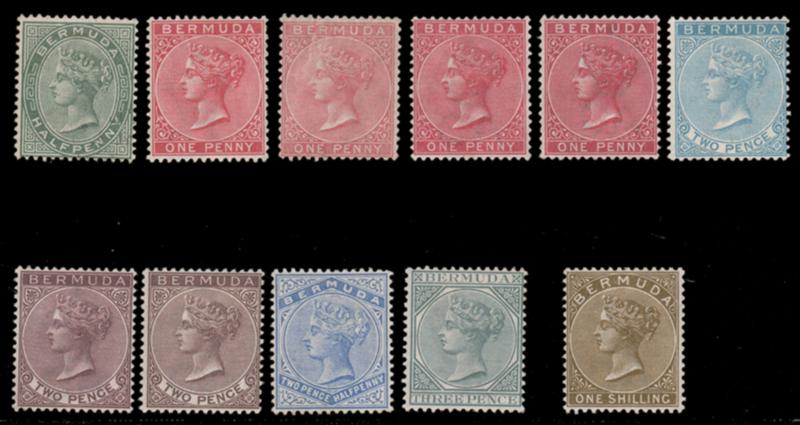 BERMUDA, 1883-93, ½p-1sh VICTORIA WMK CA GROUP INCL. SHADES, #18, 19, 19a (slight crease), 19b, 19c, 20, 21, 21a, 22, 23, 25, fresh, LH or h.r., fine-very fine, cat. $570.00 (Image)