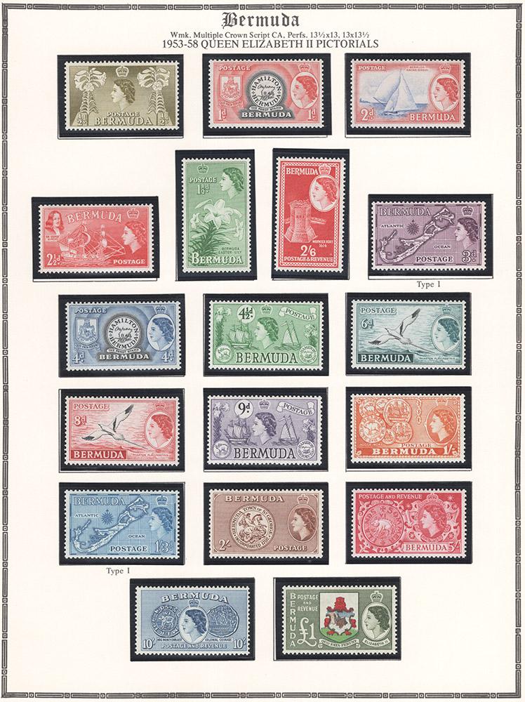 BERMUDA ALMOST COMPLETE QEII ERA MINT NEVER HINGED COLLECTION 1953-1990s, quite complete thru 1994, thereafter plenty of sets 1997-2008, incl. the major sets such as nos. 143-62, 175-91, 255-71, 253b//267a, 482-98, 668-84, often extra varieties as well as the set of pages allows for this, very fine throughout, cat. $1,500.00, we scanned 17 sample pages (Image)