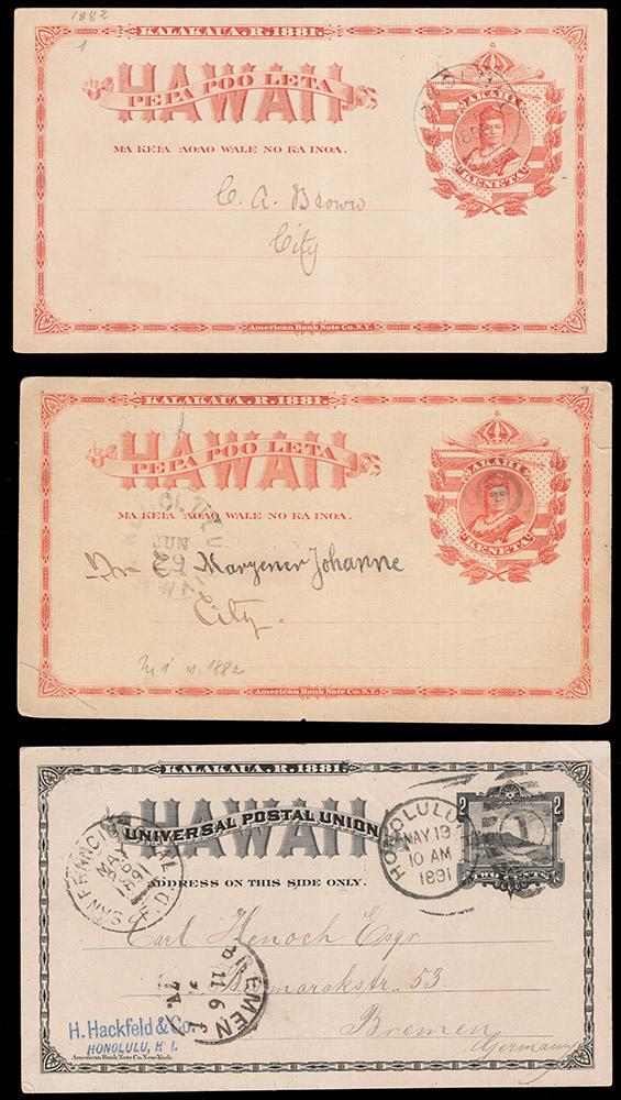 HAWAII, 1882-92, 1c RED POSTAL CARD & 2c BLACK POSTAL CARD, #UX1 two, both local usages, 2c to Germany, fine-very fine, cat. $240.00 (Image)