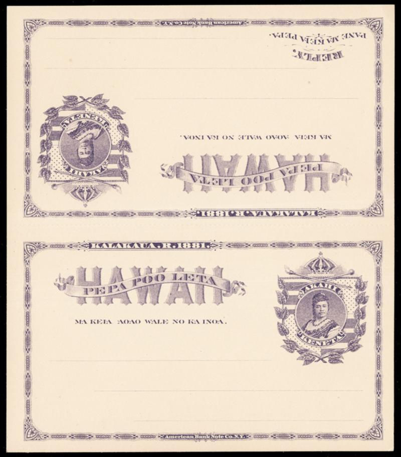 HAWAII, 1883, 1c+1c PURPLE REPLY POSTAL CARD UNSEVERED MINT, #UY1, unfolded, pristine and very fine, cat. $400.00 (Image)