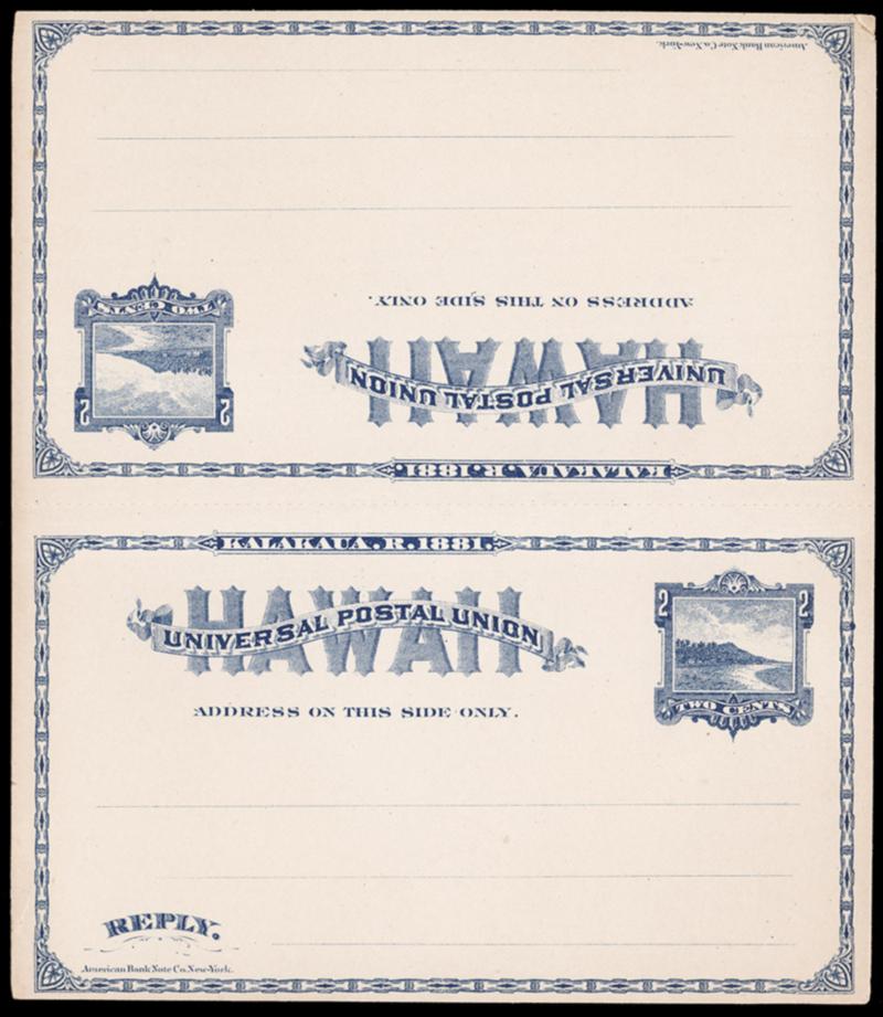HAWAII, 1883, 2c+2c DARK BLUE REPLY POSTAL CARD UNSEVERED MINT, #UY2, unfolded, tiny corner crease, fine-very fine, cat. $400.00 (Image)