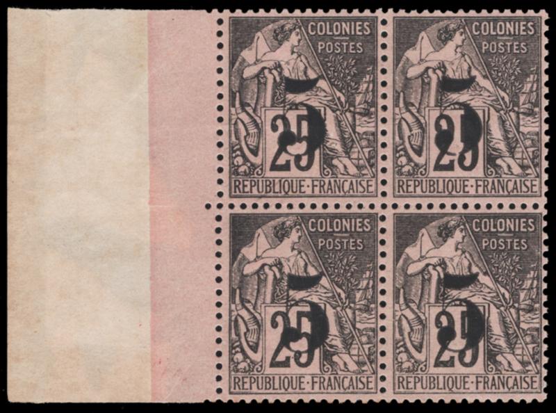 COCHIN CHINA, 1897, 5c on 25c BLACK ON LAVENDER BLOCK MINT, #4, well-centered, lightly mount disturbed o.g., very fine, cat. $240.00, Yvert #4 @ €200.00 (Image)