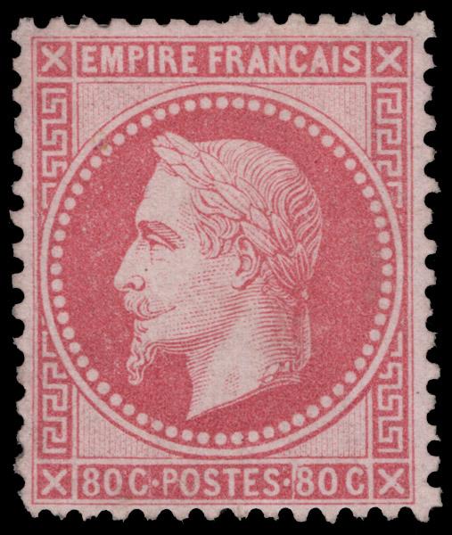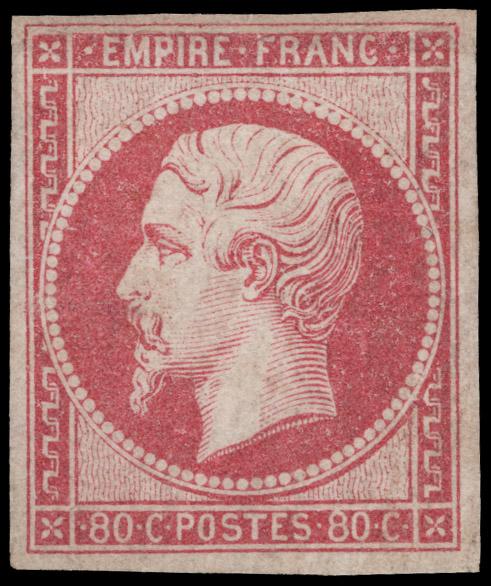FRANCE, 1860, 80c ROSE ON PINKISH UNUSED, #20, full margins, regummed, fine-very fine, cat. $950.00, Yvert #17B @ €1,200.00, both values for no gum (Image)