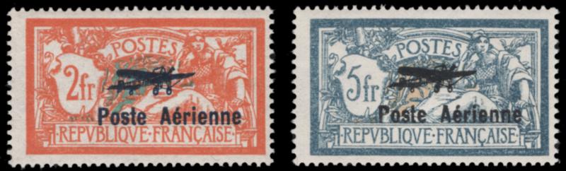 FRANCE, 1927, 2fr-5fr AIR POST MINT NEVER HINGED, #C1-C2, fresh and well-centered for this particular issue, fine-very fine, both signed Scheller, cat. $800.00, Yvert PA1-2 @ €950.00 (Image)