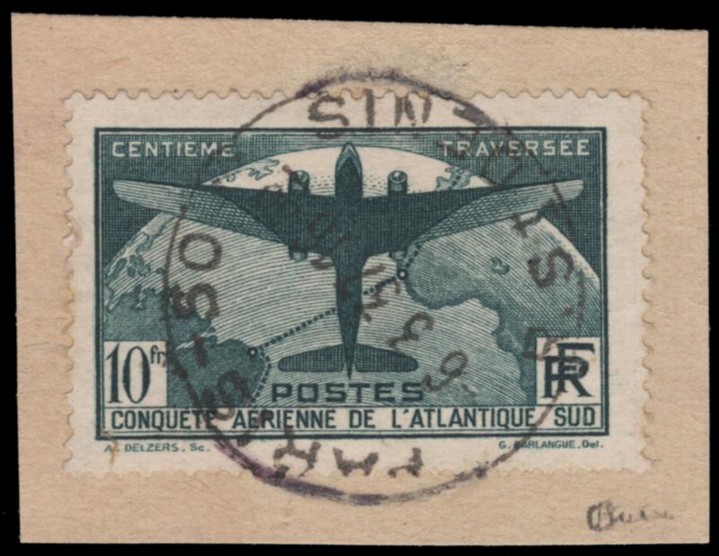 FRANCE, 1936, 10fr TRANS-ATLANTIC AIR POST USED ON PIECE, #C17, Paris d.s., very fine, signed Calves, cat. $1300.00, Yvert #321 @ €150.00 (Image)