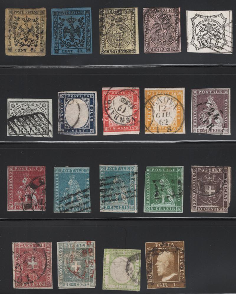 ITALIAN STATES GROUP, 19 stamps, incl. Modena 3, 8, Parma 1, 3, 5, 9, Sardinia 12, 13, 14, Tuscany 8, 12, 13, 13a, 14, 19, 20b, 21, Sicily 11a, Italy 19a, margins as illustrated, few faults, most sound, cat. $4,700.00 (Image)