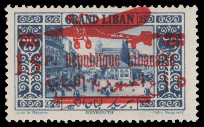GRAND LIBAN, 1929, 15p on 25p ULTRAMARINE AIR POST TYPE I MINT, #C36, fresh, h.r., very fine, cat. $225.00, Yvert PA #36 @ €275.00 (Image)