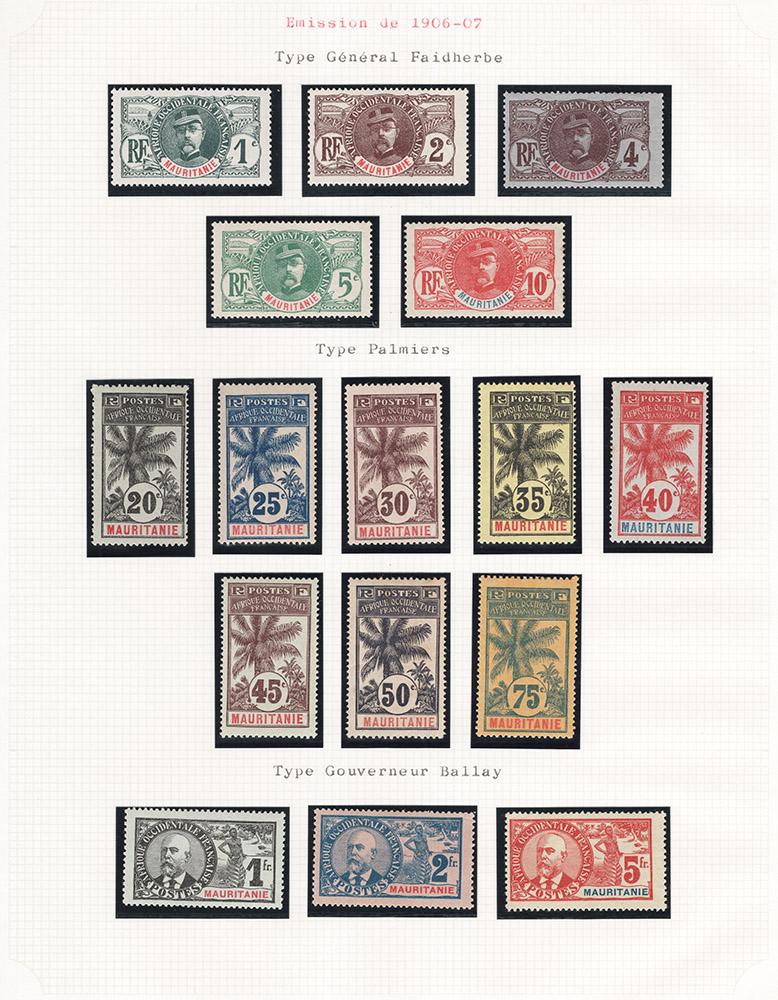 MAURITANIA, BEAUTIFUL MINT COLLECTION 1906-42 ON PAGES, virtually complete incl. e.g. nos. 1-17*, 76-108*, J1-8*, excellent condition throughout, fine-very fine, cat. $850.00 (Image)