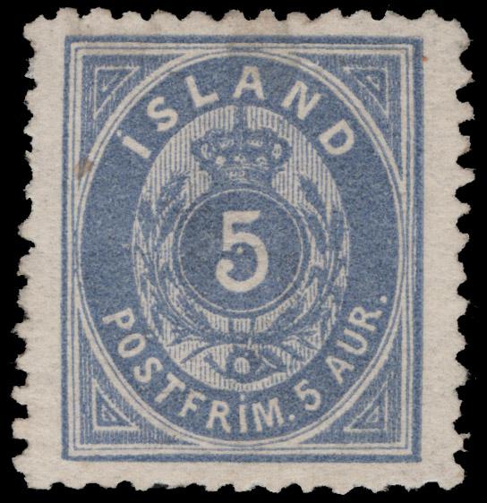 ICELAND, 1876, 5a BLUE PERF 12¾ MINT, #8, beautiful jumbo single. lightly hinged o.g., choice very fine, cat. $475.00 (Image)