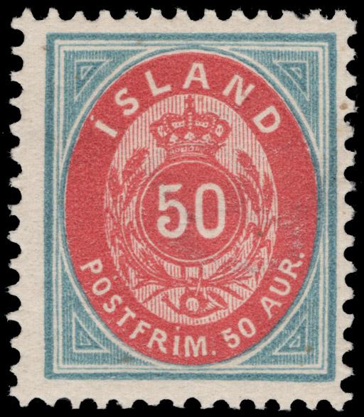 ICELAND, 1898, 50a BLUE & CARMINE PERF 12¾ NH, #30, fresh, fine-very fine, scarce key stamp to the issue, signed George Buhler, cat. $1,350.00 (Image)