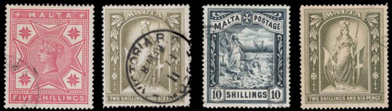 MALTA,1886-1919, 2sh6p-10sh VICTORIA HIGH VALUES USED, #14, 17-18, 64, well-centered, fresh and sound singles, very fine, cat. $328.50 (Image)
